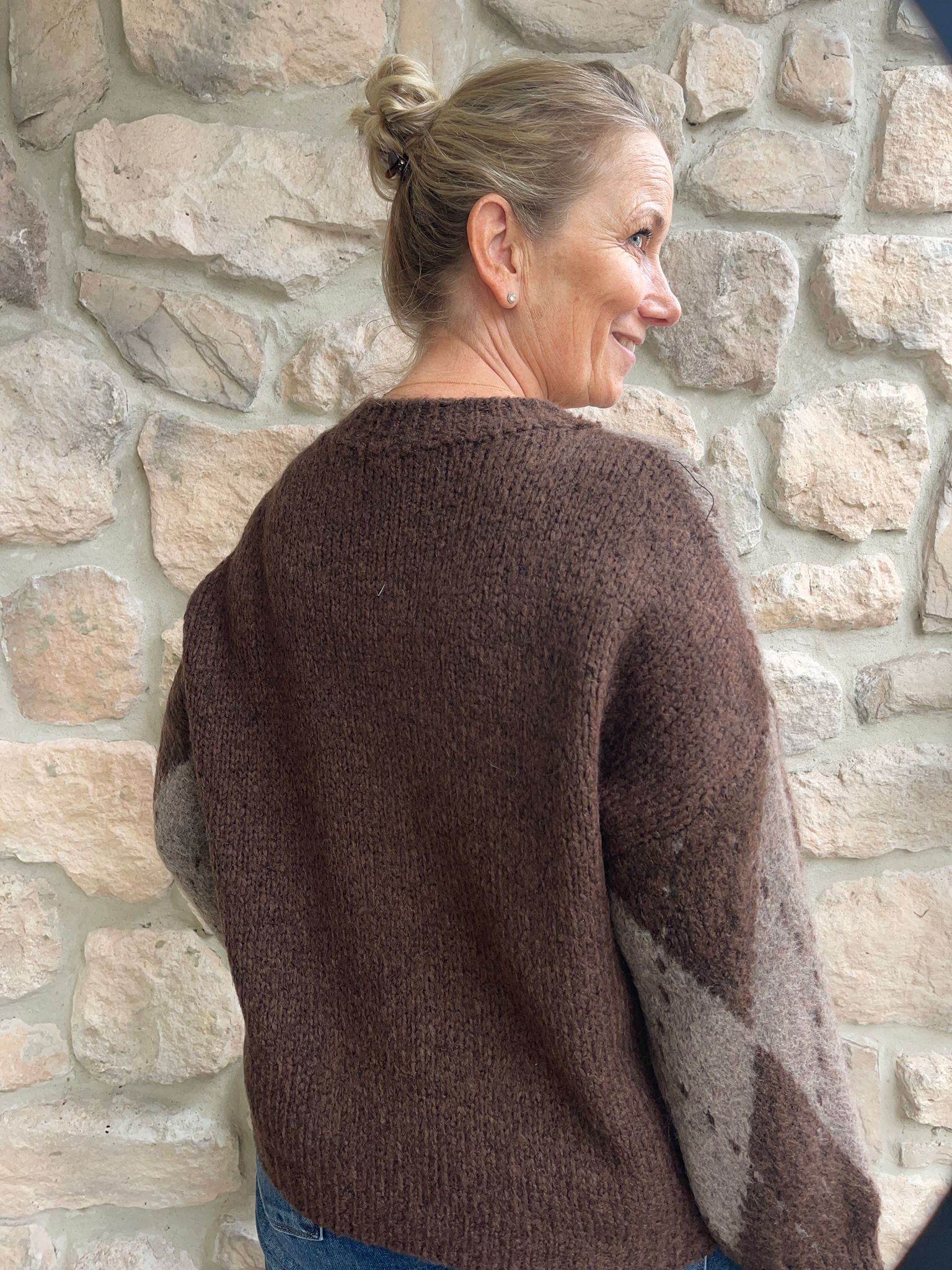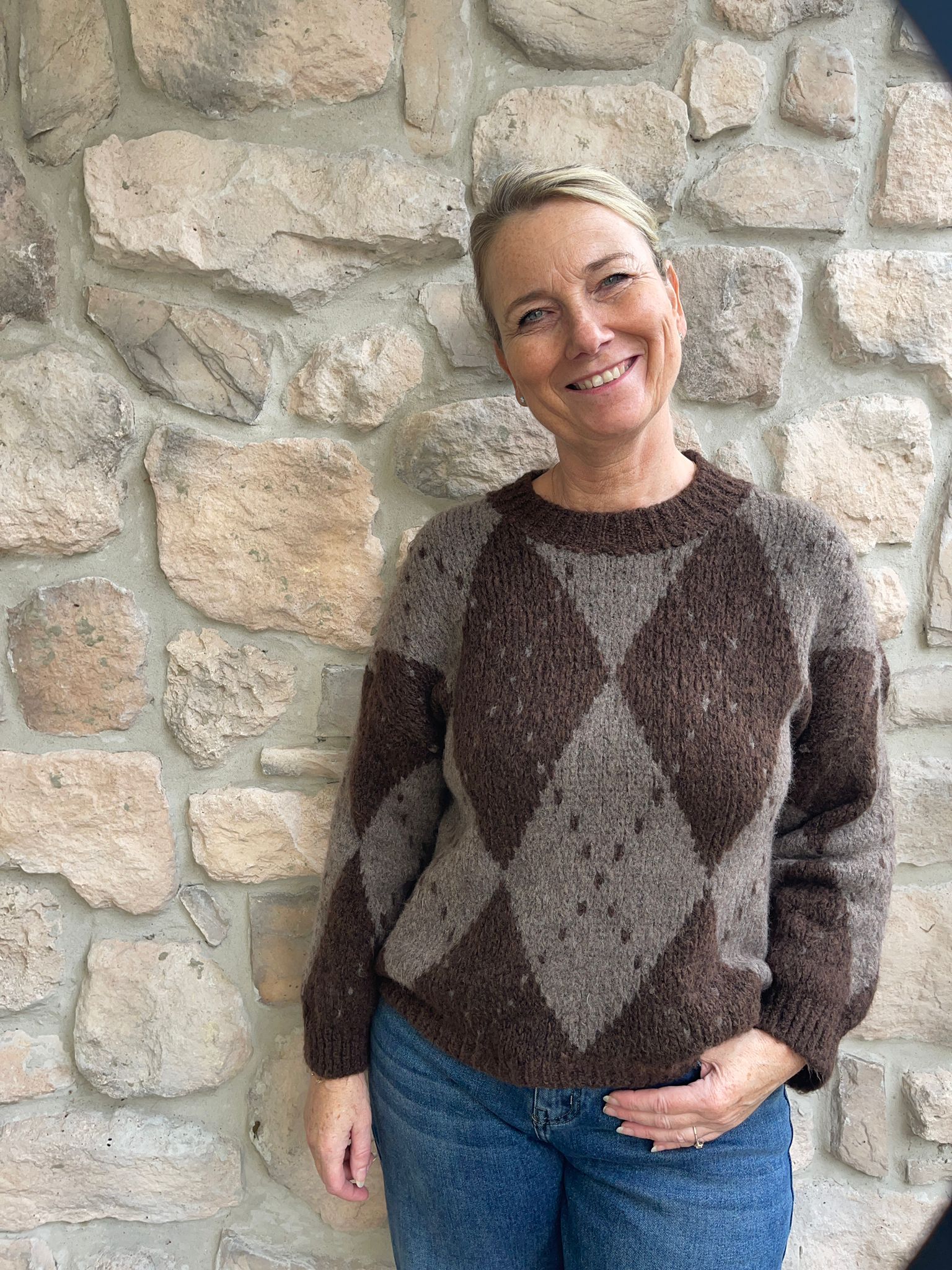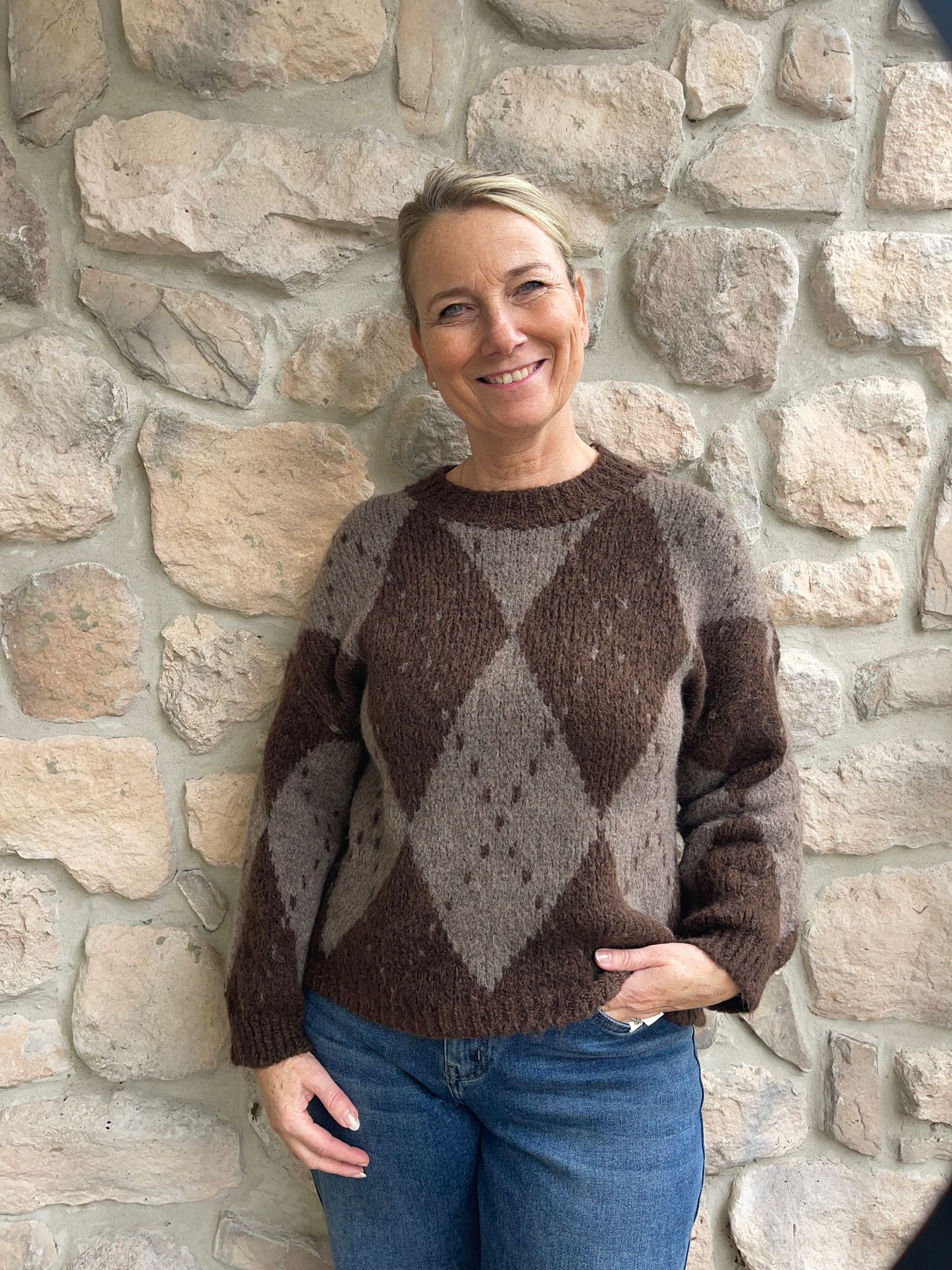 Deze geruite trui is 1 maat en valt tot maat 44.